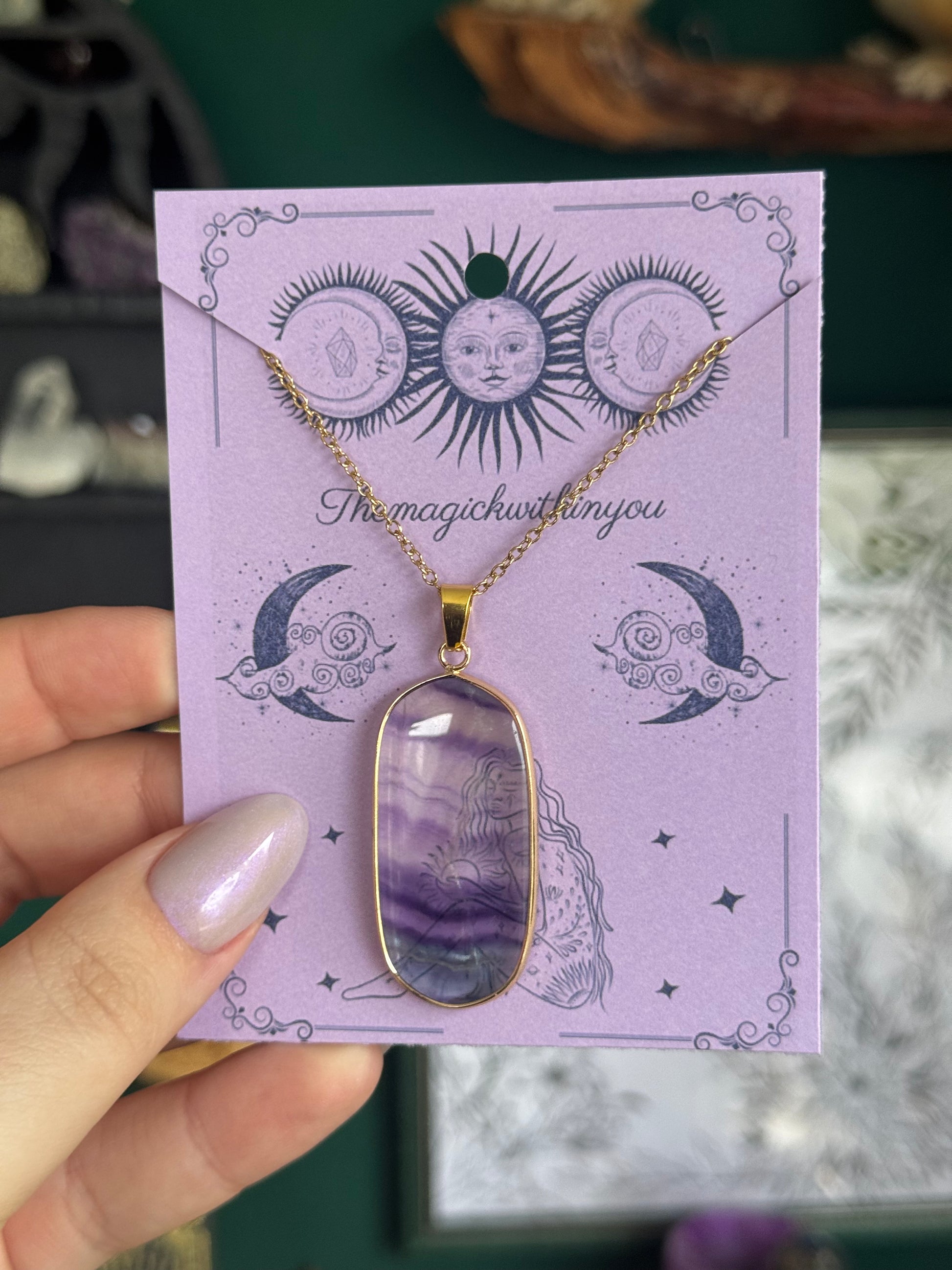 Zart schimmernd und doch voller Tiefe: Diese goldfarbene Edelstahlkette trägt einen langgezogenen, ovalen Fluorit, eingefasst in glänzendes Messing. Jeder Stein ein kleines Kunstwerk – mal mehr zartgrün, mal mehr mit violetter Ader, aber immer wunderschön wie ein bunter Nebeltraum.