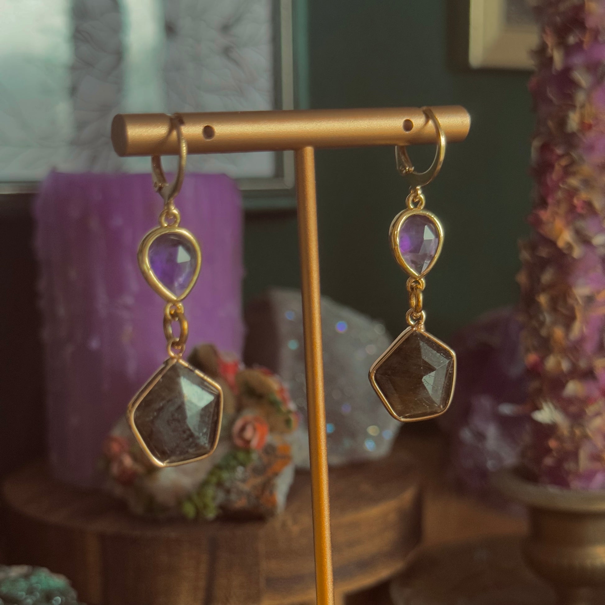 Oben sitzt ein facettierter Amethyst in Tropfenform, eingefasst in warm schimmerndem Messing. Darunter folgt ein tiefdunkler Labradorit, ebenfalls in Messing gefasst – sein Schimmer zeigt sich nur im richtigen Licht und verleiht dem Schmuckstück eine fast okkulte Atmosphäre.