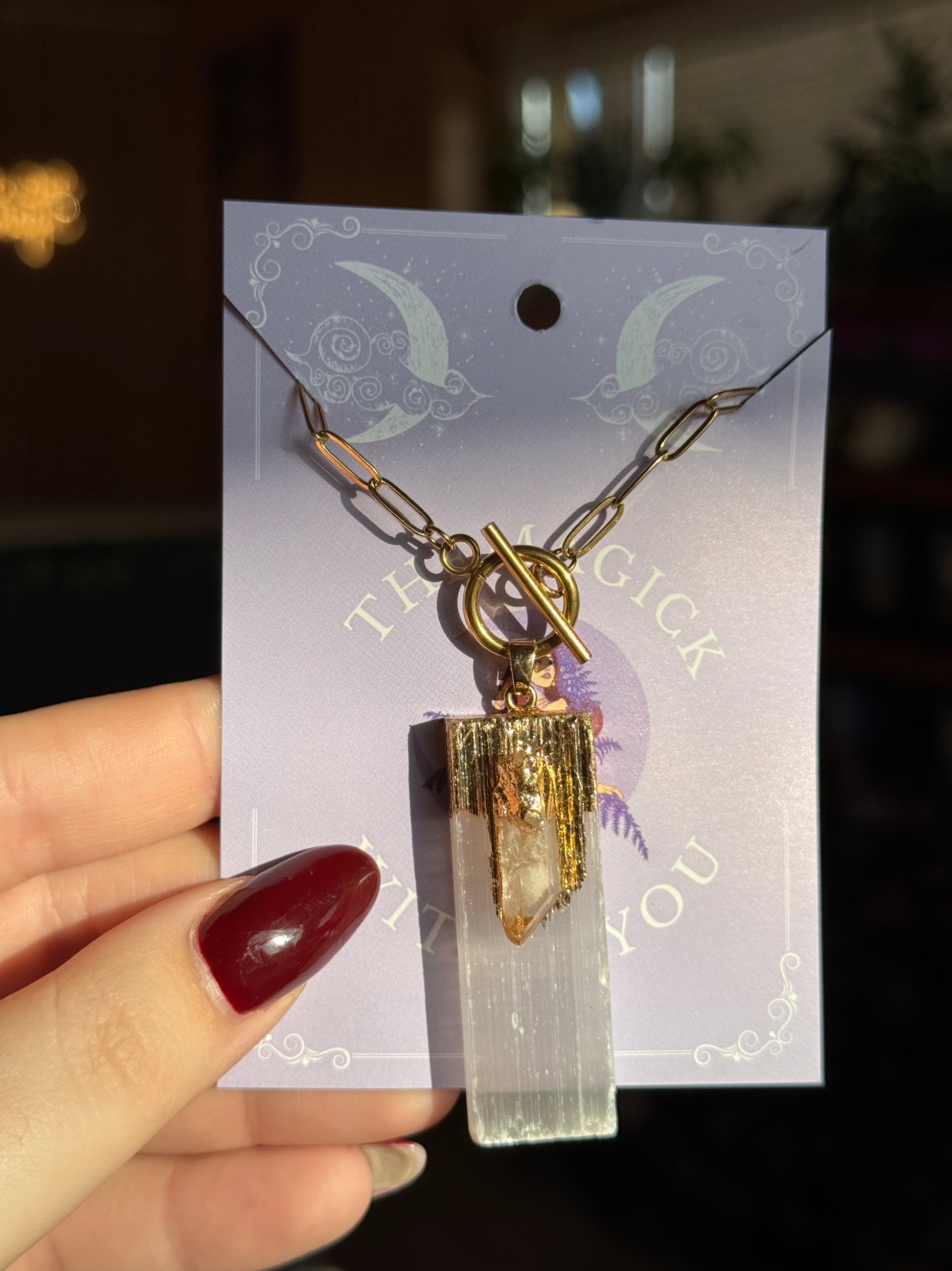 Diese Paperclip-Kette aus Edelstahl verbindet modernes Design mit der klaren Schönheit natürlicher Kristalle. Der große, rechteckige Anhänger kombiniert natürlichen Quarzkristall und Selenit zu einem ausdrucksstarken Statement-Piece, das gleichzeitig ruhig und präsent wirkt.