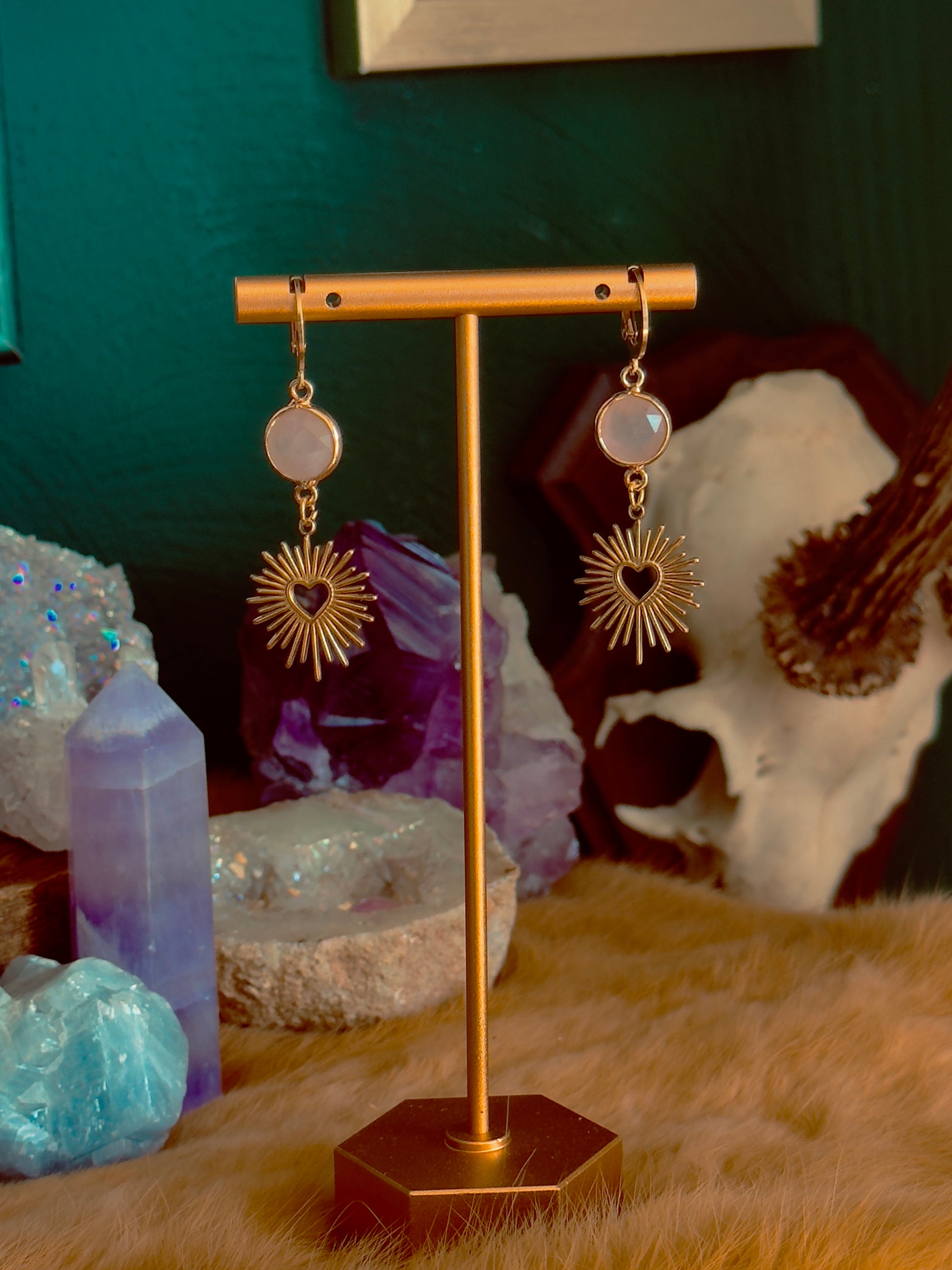 Zart und voller Wärme: Diese streng limitierten Ohrringe vereinen einen rund facettierten Rosenquarz mit einem goldfarbenen Edelstahlanhänger in Herzform – umgeben von stilisierten Sonnenstrahlen. Sie wirken wie ein leiser Lichtimpuls direkt ins Herzchakra.