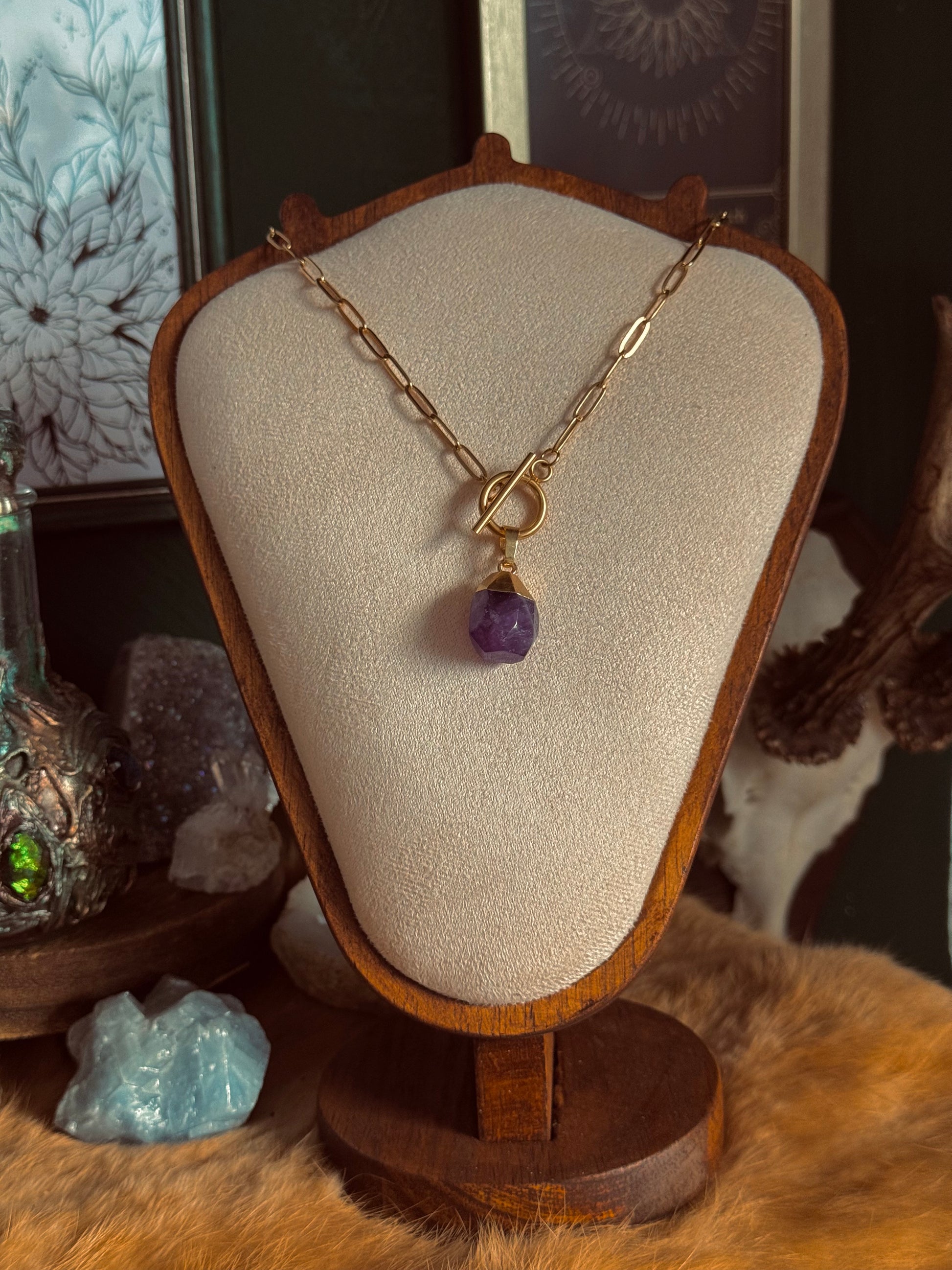 Die Kette selbst besteht aus goldfarbenem Edelstahl mit markantem Gliederdesign und Knebelverschluss. Elegant, robust und ideal, um den Amethyst als zentrales Highlight zu tragen.