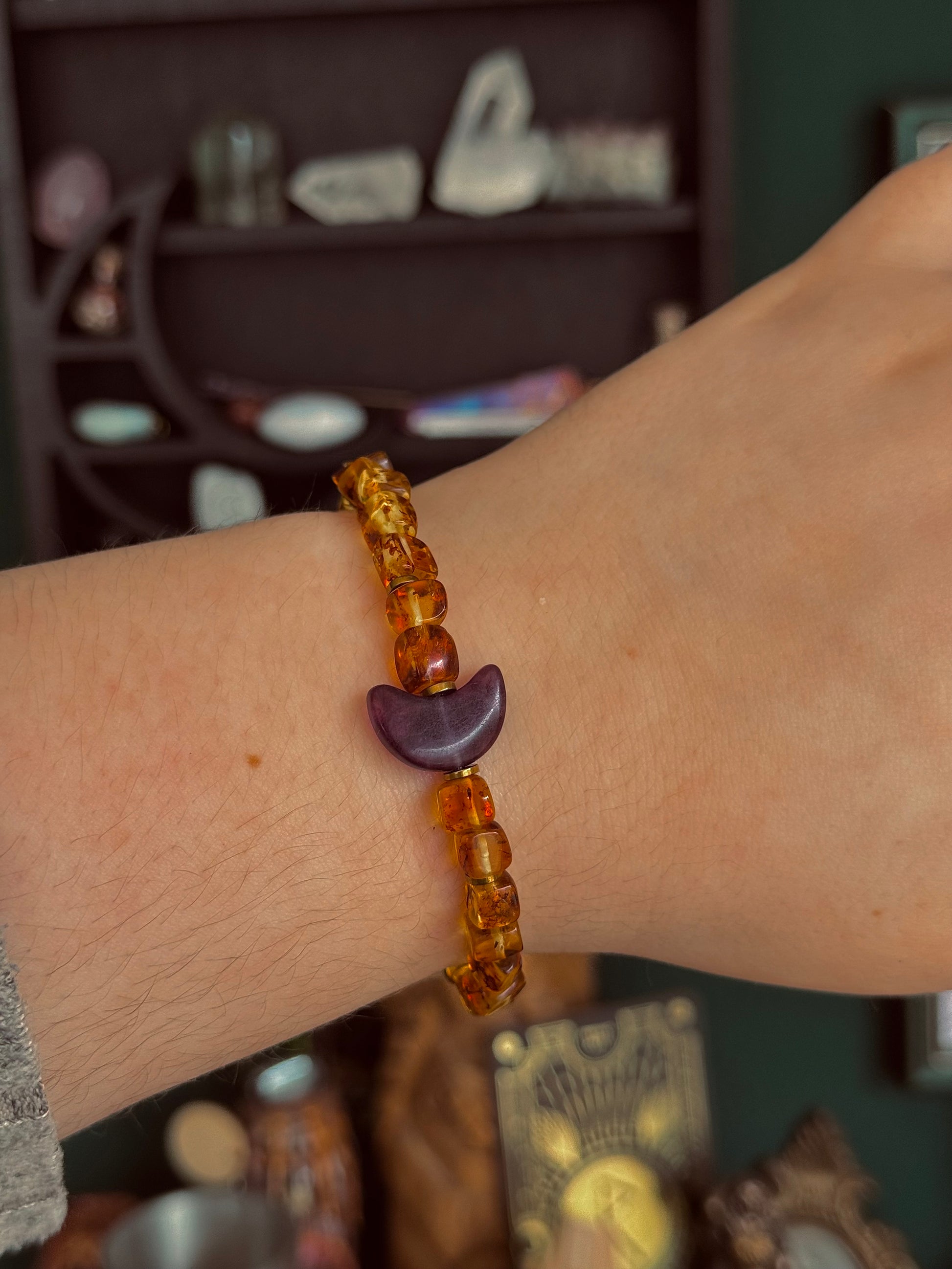 Die Symbolik des Mondes kann für Wandel, Intuition und innere Zyklen stehen, während Bernstein für Wärme und Lebendigkeit steht. Zusammen entsteht ein Schmuckstück, das wie ein kleiner Begleiter für magische Herbstabende wirkt.
