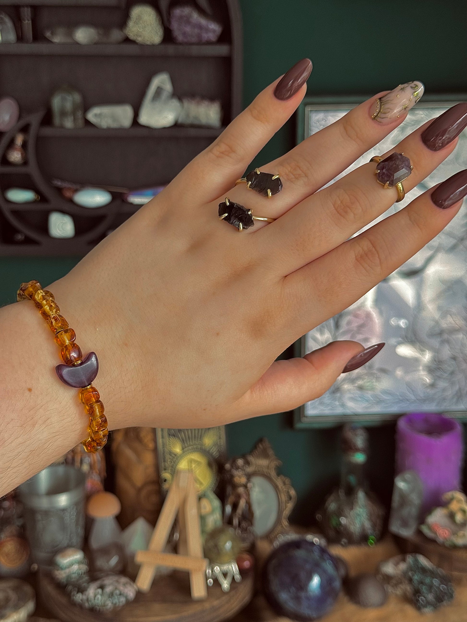 ✨ Material: Bernstein (naturbelassen, Würfelform), Fluorit (Mondform), Hämatit (synthetisch, silber- oder goldfarben), Edelstahl-Verschluss (silber- oder goldfarben), Gummiband