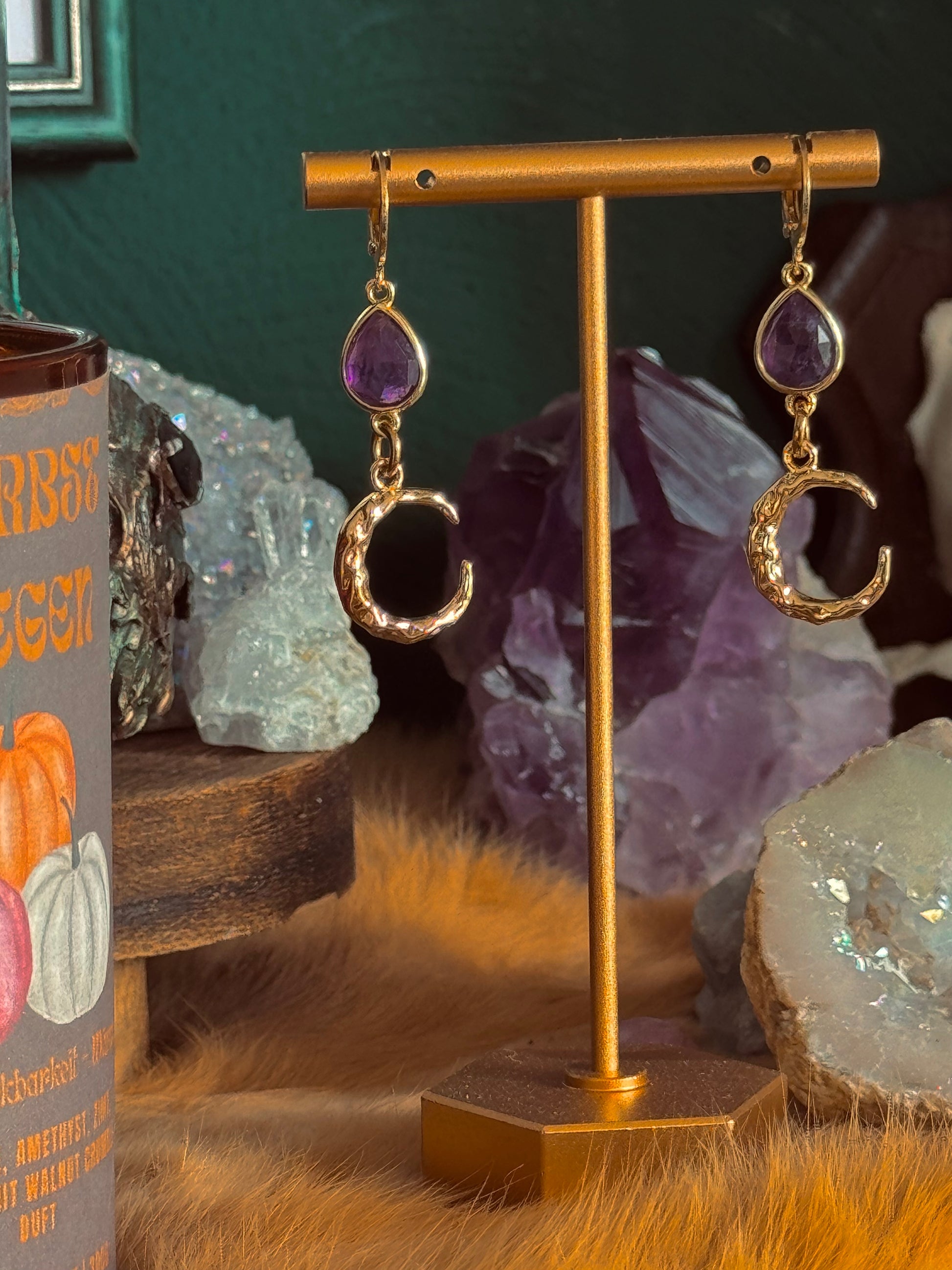 Diese besonderen Ohrringe vereinen den schimmernden Amethyst in Tropfenform mit einem goldfarbenen Halbmond-Anhänger. Gefertigt aus Messing und Edelstahl, sind sie zugleich elegant, verspielt und voller Symbolik.