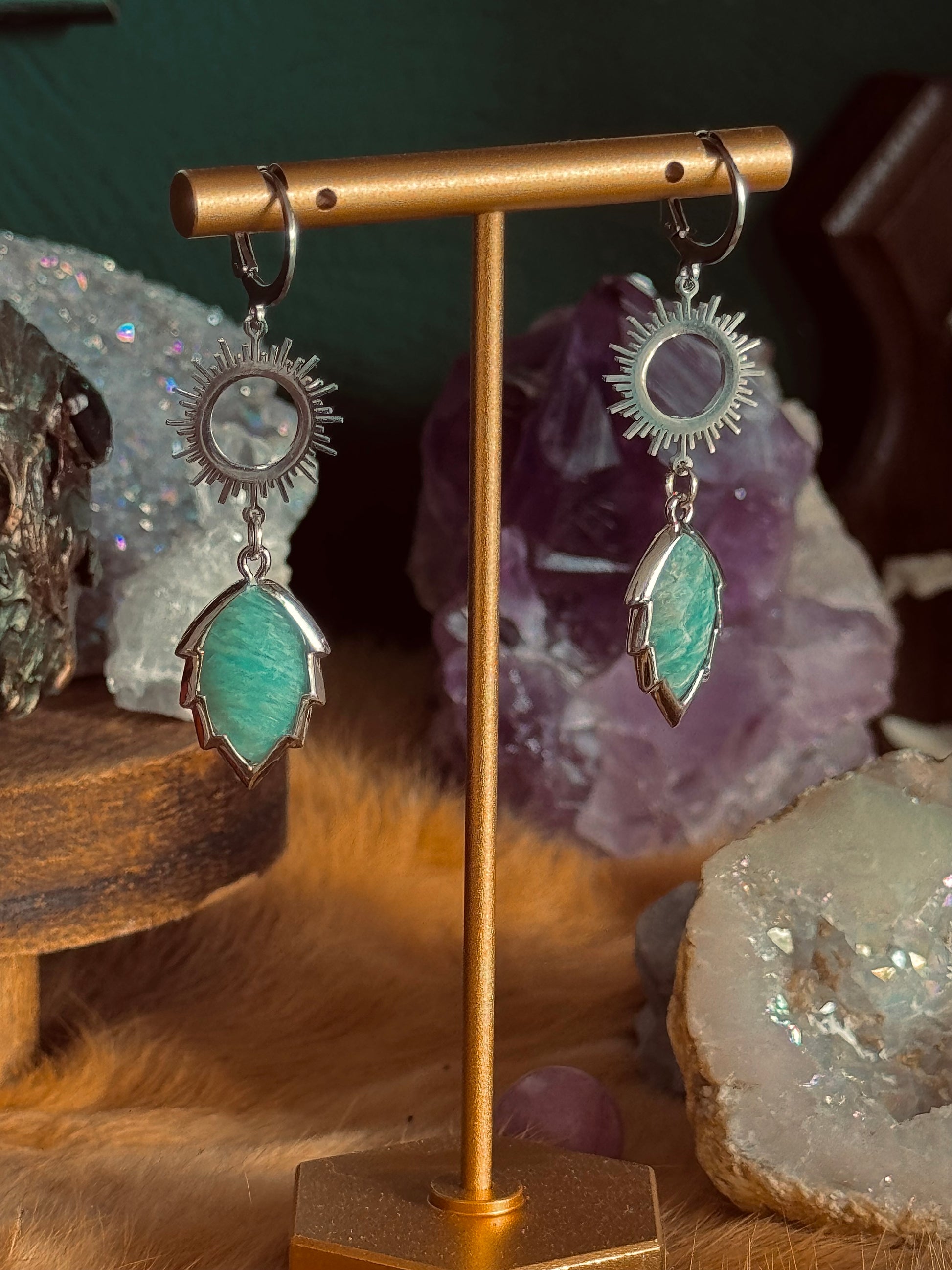 Ein Hauch von Sonne, eingefangen im Wandel der Natur: Diese Ohrringe aus silberfarbenem Edelstahl vereinen ein strahlendes Sonnenornament mit einem Amazonit in Blattform. Das sanfte Grünblau des Amazonits erinnert an frische Natur, während die Form des Blattes zugleich einen Bezug zu Wandel und Erneuerung trägt – ein Motiv, das besonders schön im Herbst seine Symbolik entfaltet.