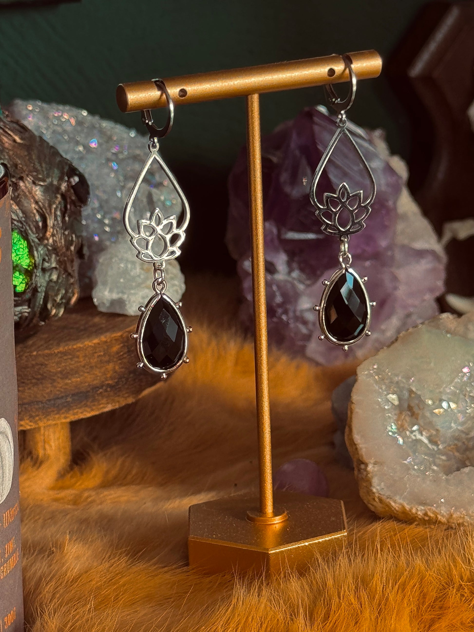 Mystisch und elegant: Diese Ohrringe vereinen filigrane Lotus-Verbinder aus silberfarbenem Edelstahl mit einem tiefschwarzen, facettierten Obsidian, eingefasst in einer feinen Platinfassung. Das Zusammenspiel aus klaren Linien und dunklem Glanz macht sie zu einem besonderen Schmuckstück für spirituelle Seelen und Liebhaber:innen mystischer Ästhetik.