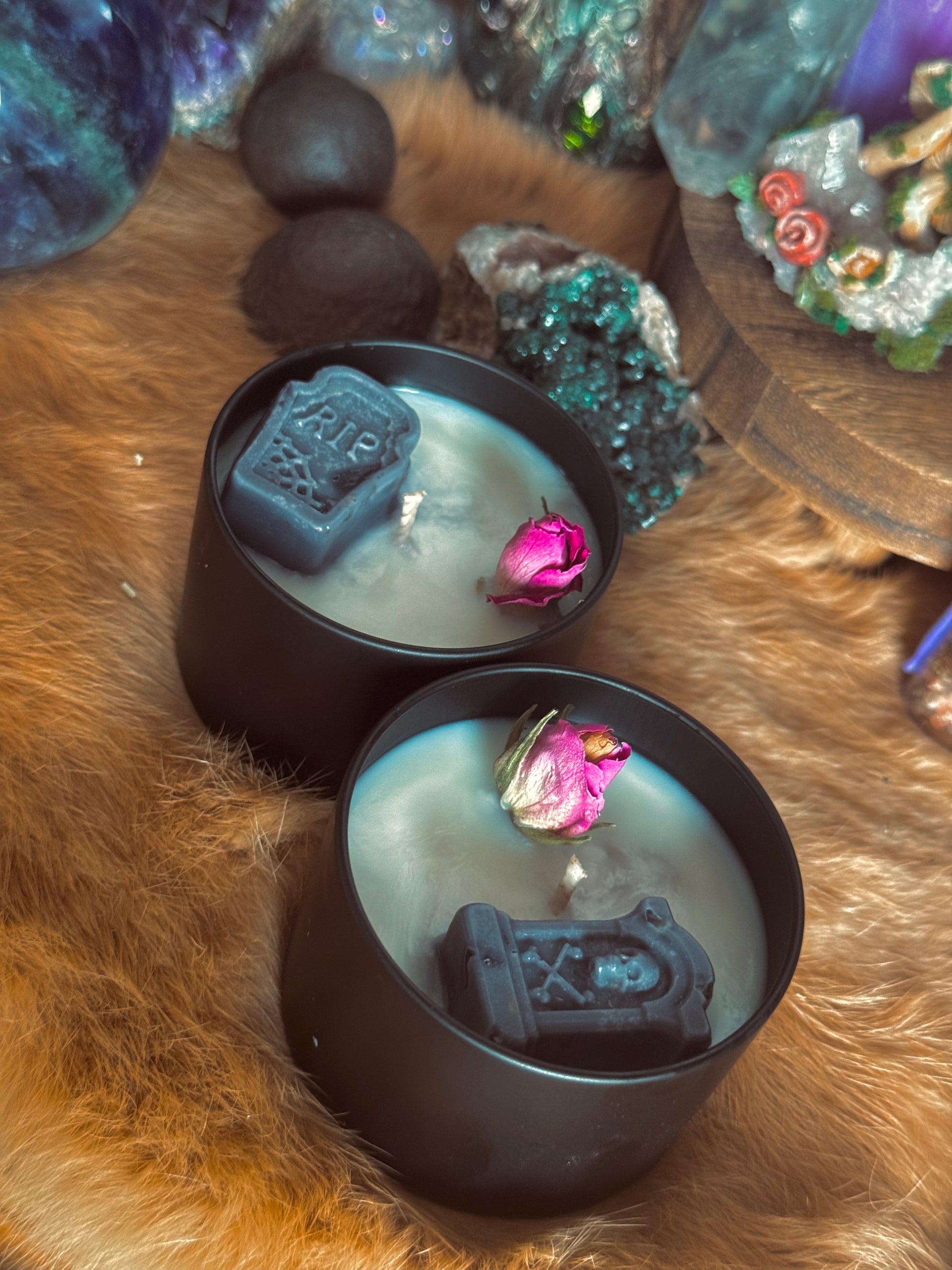 Graveyard Delight: Das besondere Highlight verbirgt sich in der Mitte: Ein schwarzer Grabstein aus Sojawachs, gefüllt mit Palo Santo Duftöl, Lavendelblüten und Amethystchips. Sobald die Kerze abbrennt, schmilzt der Grabstein langsam dahin, färbt das Wachs geheimnisvoll ein und enthüllt die kleinen Blüten und Edelsteine – wie ein Ritual voller Überraschungen.