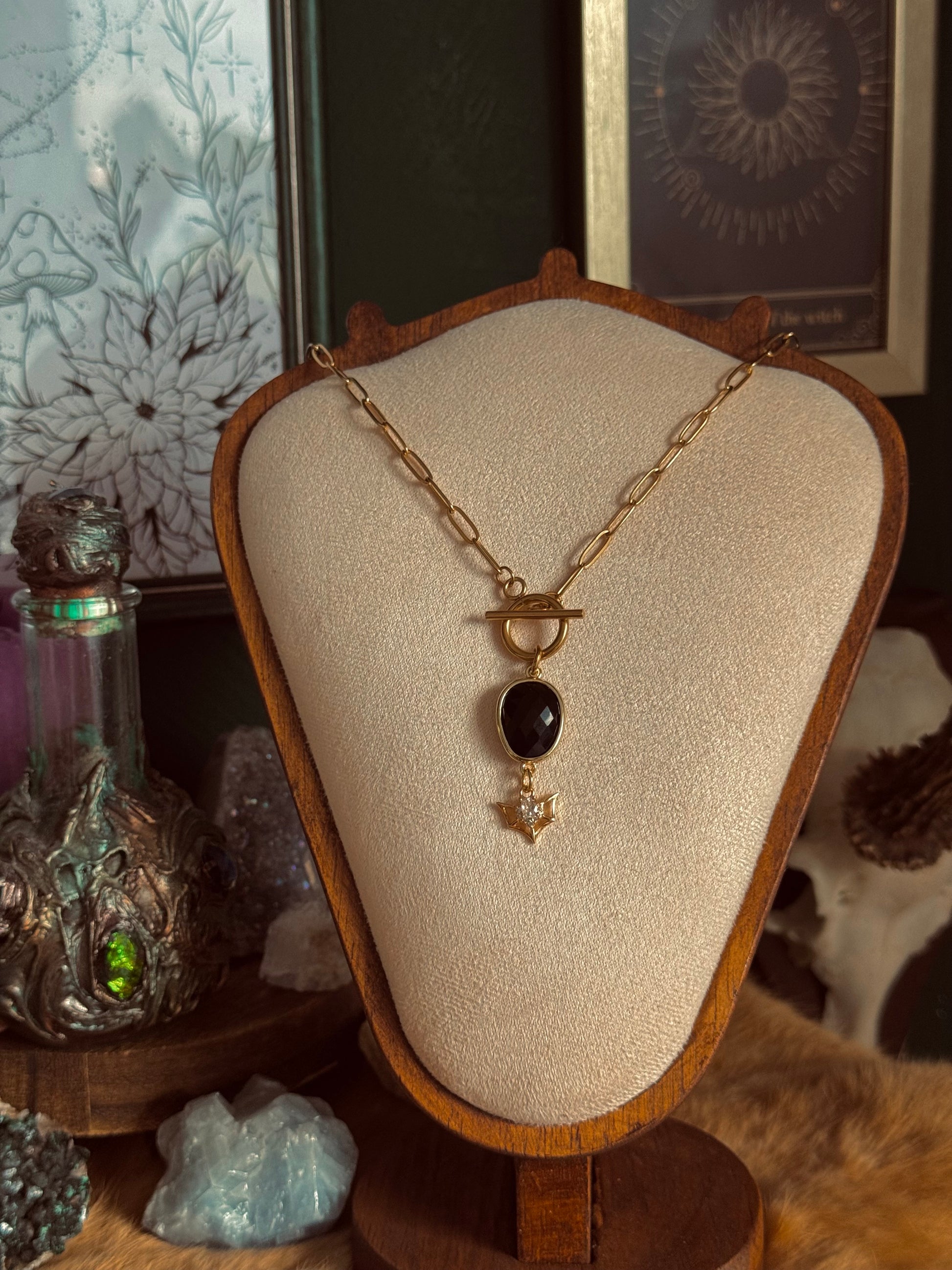 Dunkel und geheimnisvoll: Diese Kette verbindet die Tiefe eines facettierten Obsidians, eingefasst in Messing, mit einem feinen Anhänger aus Edelstahl, der eine Fledermaus mit funkelndem Zirkonia in der Mitte zeigt.