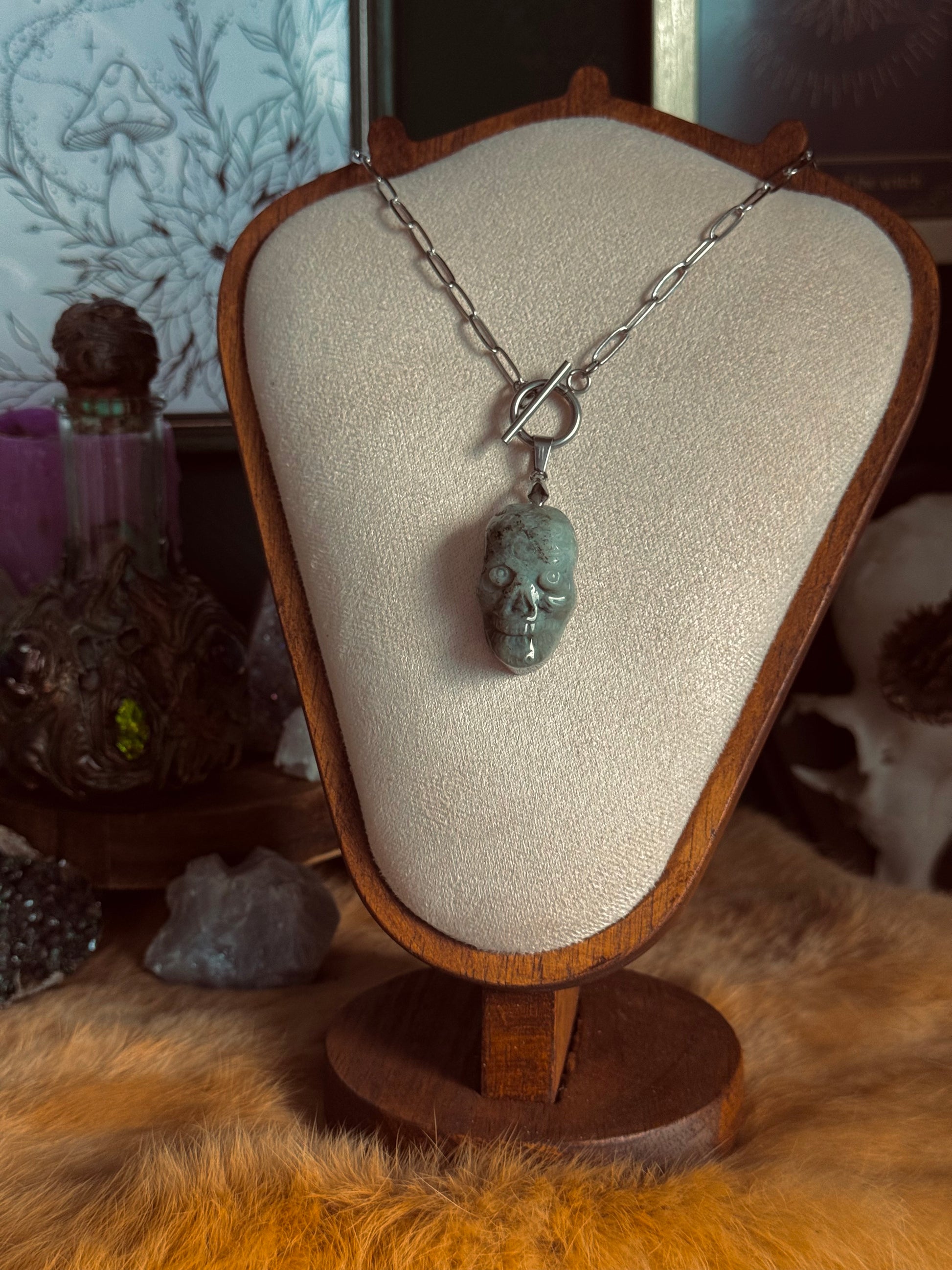 Ein Schmuckstück für alle, die das Geheimnisvolle lieben: Diese markante Kette trägt einen detailreich gearbeiteten Schädel aus Labradorit, der in faszinierenden Schattierungen schimmert. Jeder Stein ist ein Unikat – mit eigenem Muster und individuellem Charakter.