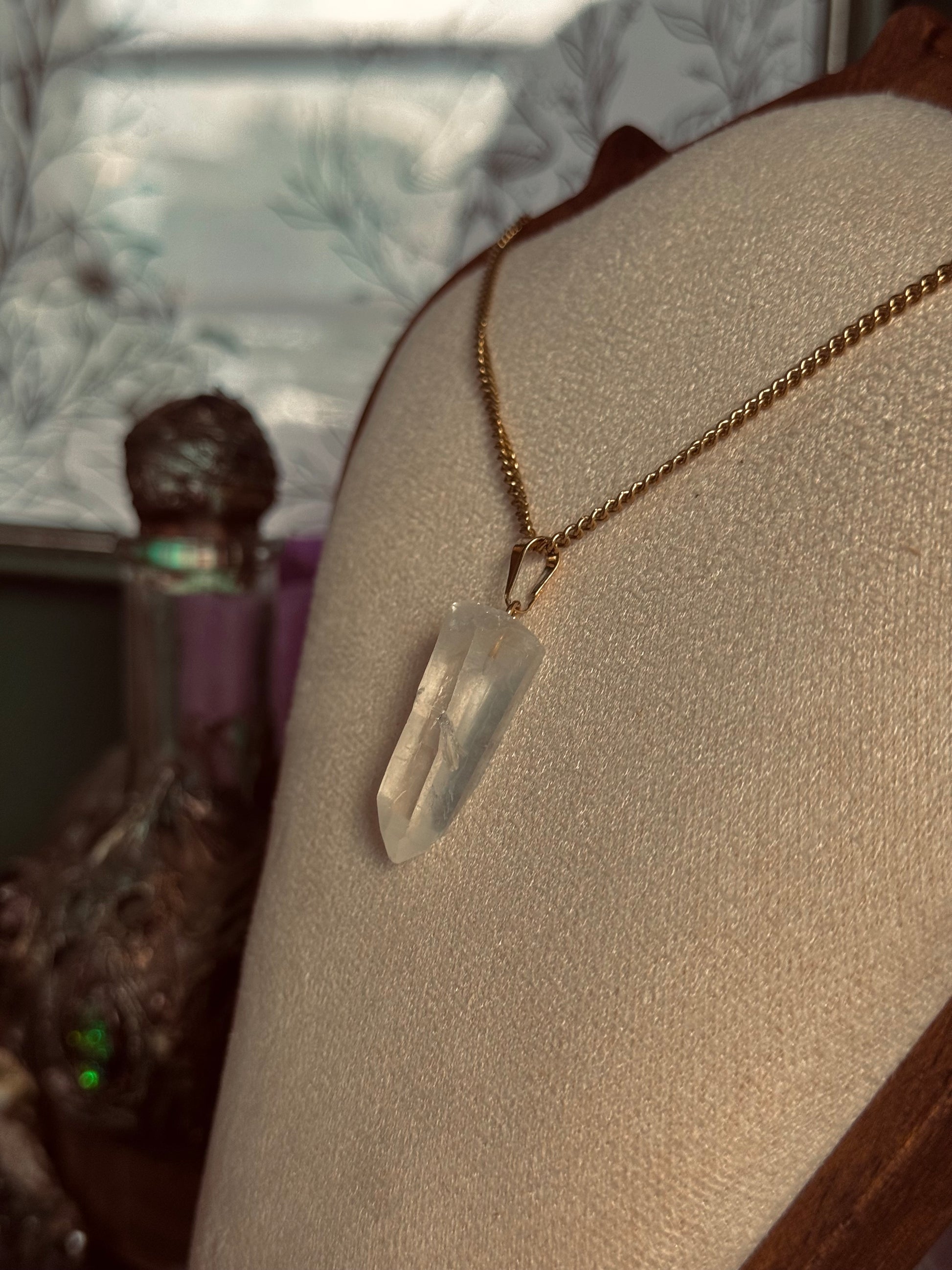 Die Kette selbst besteht aus goldfarbenem Edelstahl und ist robust wie elegant zugleich – perfekt, um den Bergkristall als reinen Mittelpunkt wirken zu lassen.