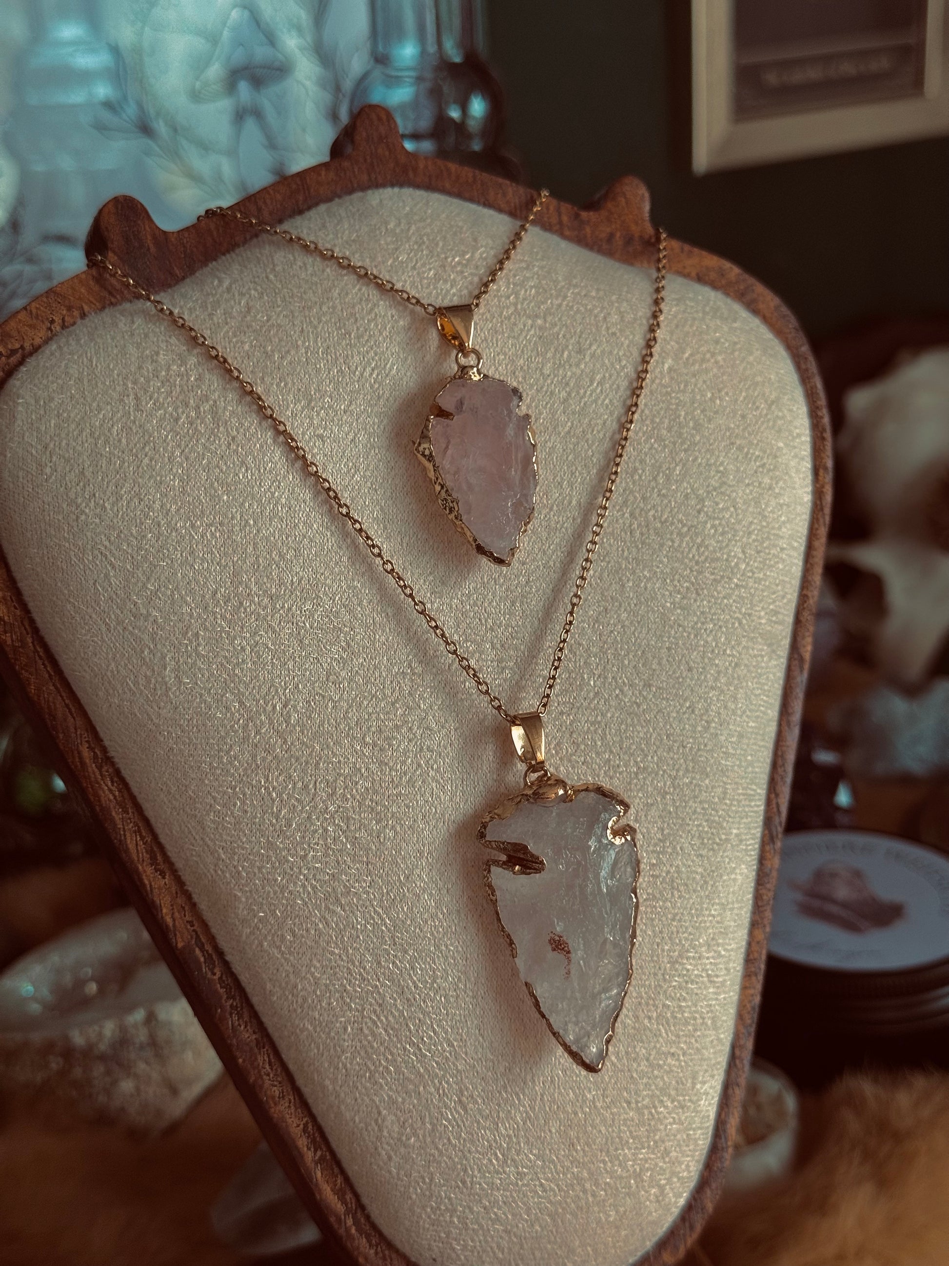 Der Speer kann symbolisch für Ausrichtung, Schutz und Entschlossenheit stehen – kombiniert mit der Klarheit des Bergkristalls entsteht ein Schmuckstück, das dich daran erinnern darf, mutig und zentriert deinen Weg zu gehen.