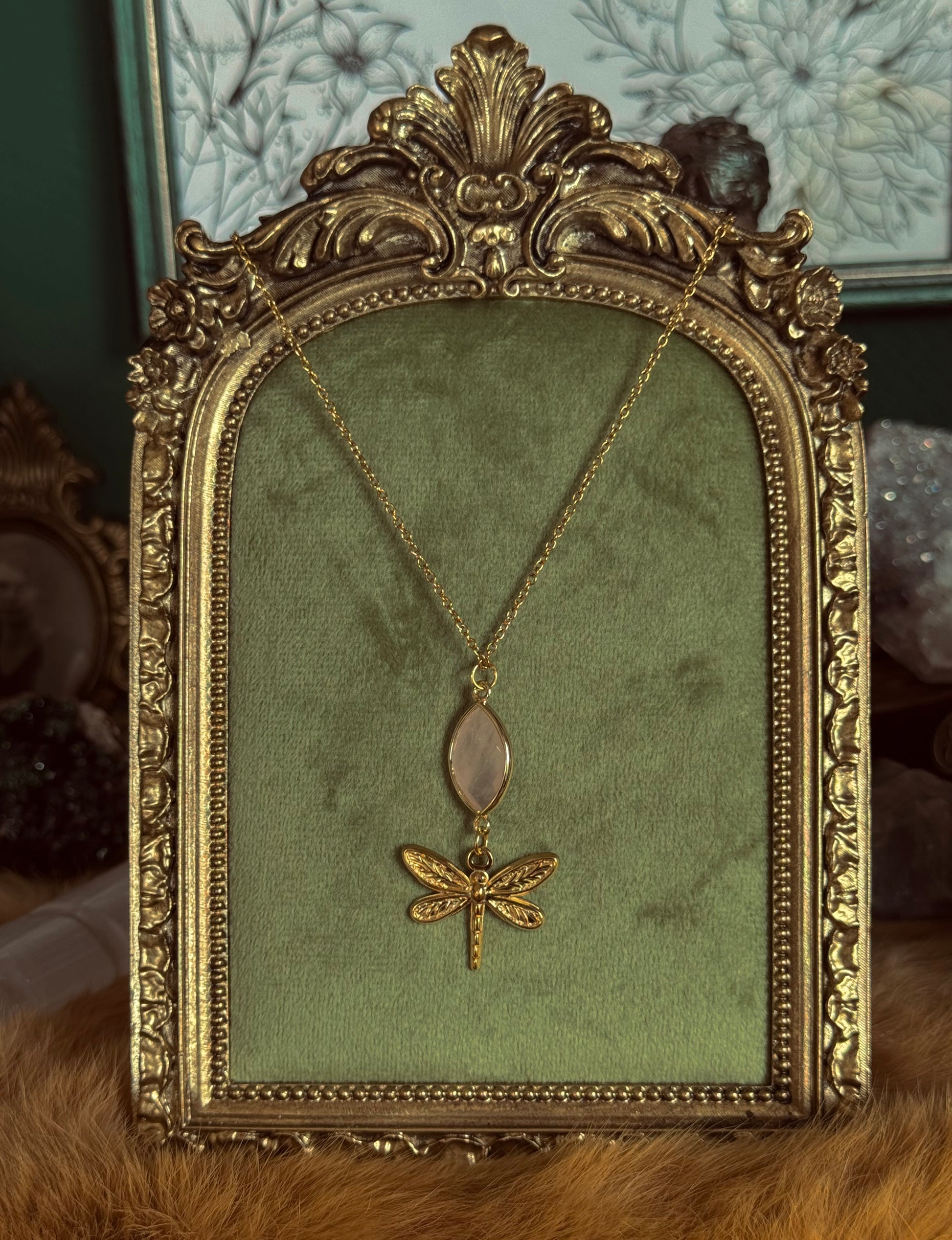 Ein ovaler -Anhänger aus facettiertem Rosenquarz bildet das Herzstück dieser zarten Kette, verbunden durch goldene Messingglieder. Als zarter Akzent fliegt eine kleine Edelstahl-Libelle an ihrer Seite.