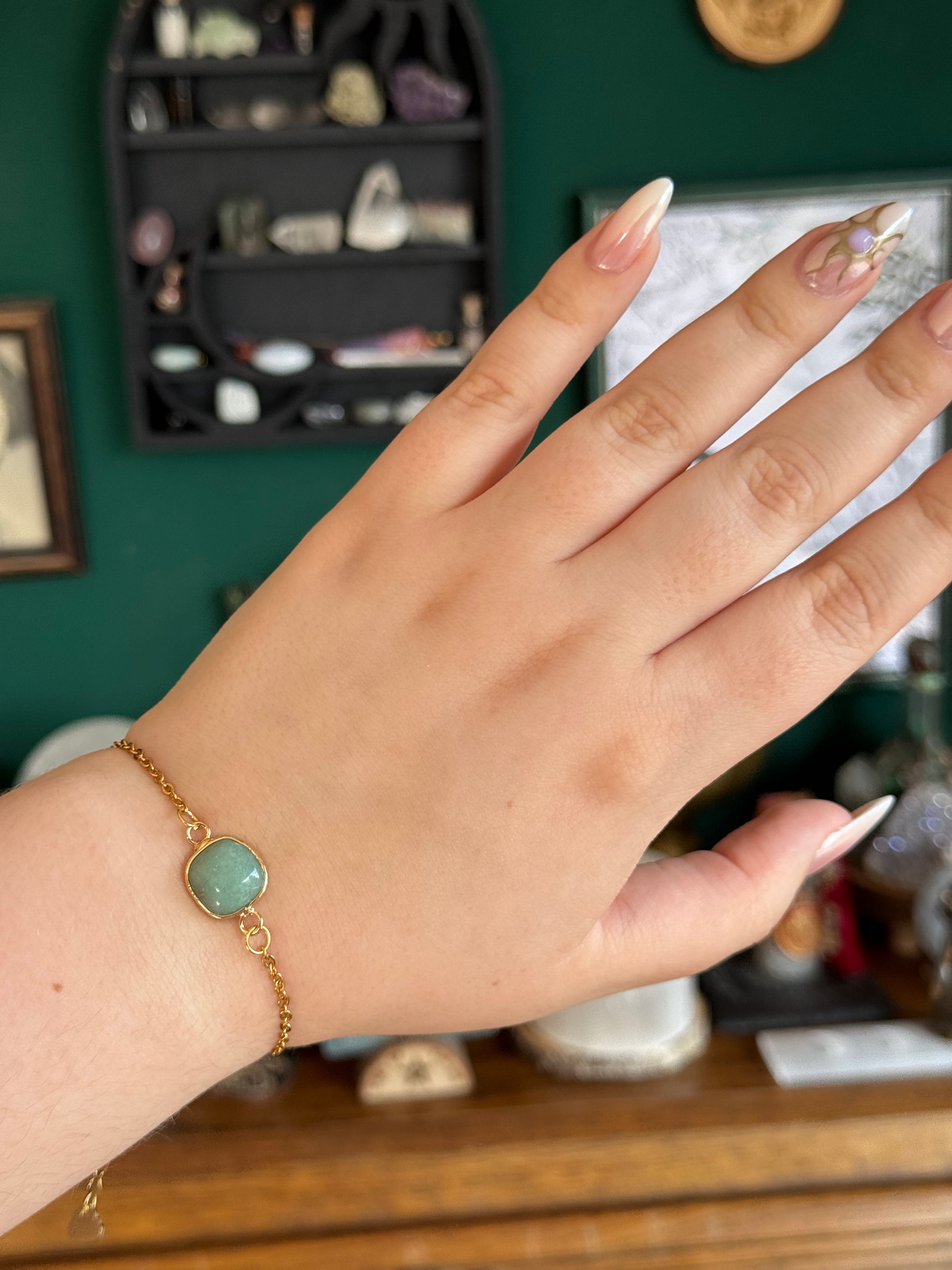 Dieses Armband hat neben den Edelsteinen auch eine Kette und einen Verschluss aus goldenem Edelstahl verarbeitet.