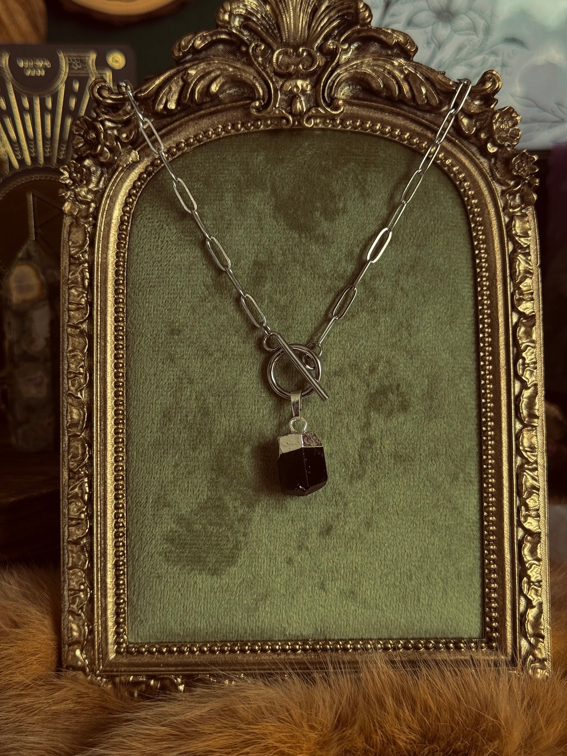 Diese silberfarbene Edelstahlkette im Büroklammer-Design mit Knebelverschluss wird von einem naturbelassenen schwarzen Turmalin geschmückt. Der rohe Edelstein ist sanft geschliffen, damit er angenehm auf der Haut liegt, aber seine ursprüngliche Form bewahrt – ungezähmt, ehrlich und kraftvoll.