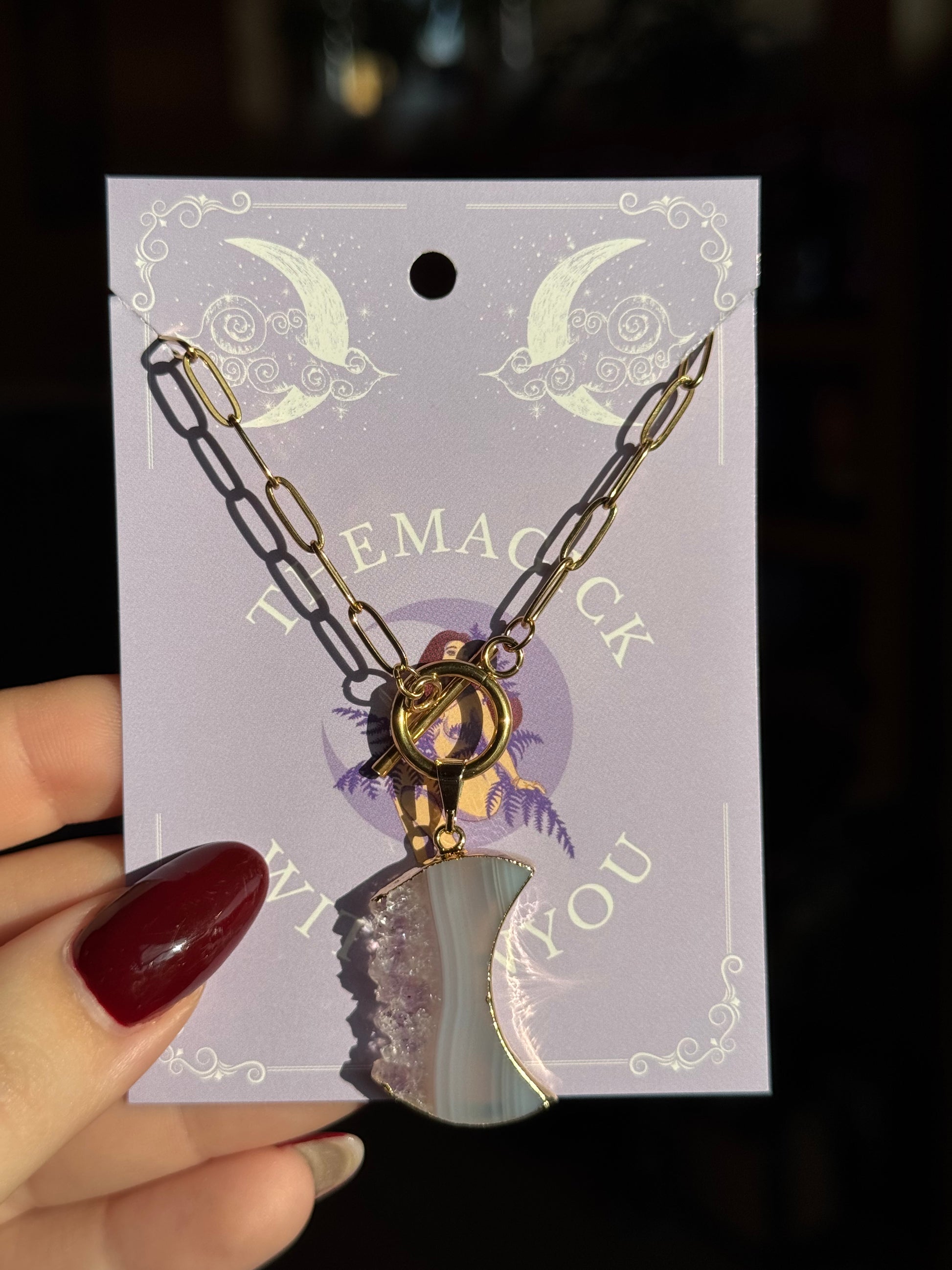 Diese Paperclip-Kette aus Edelstahl trägt einen besonderen Achat-Mondanhänger mit einer offen sichtbaren Druzy-Seite – ein Schmuckstück, das Ruhe, Tiefe und leise Mondenergie in sich vereint.