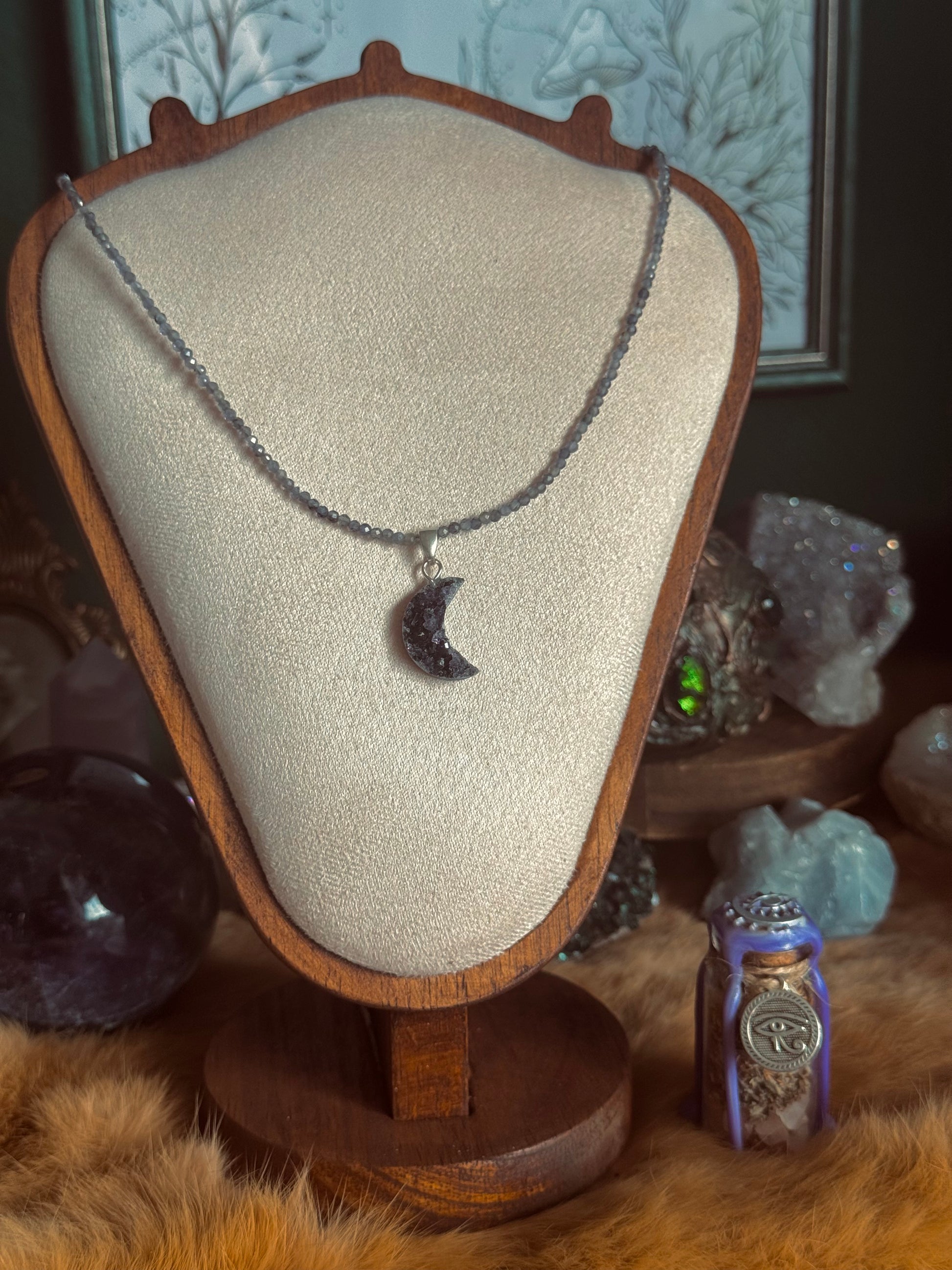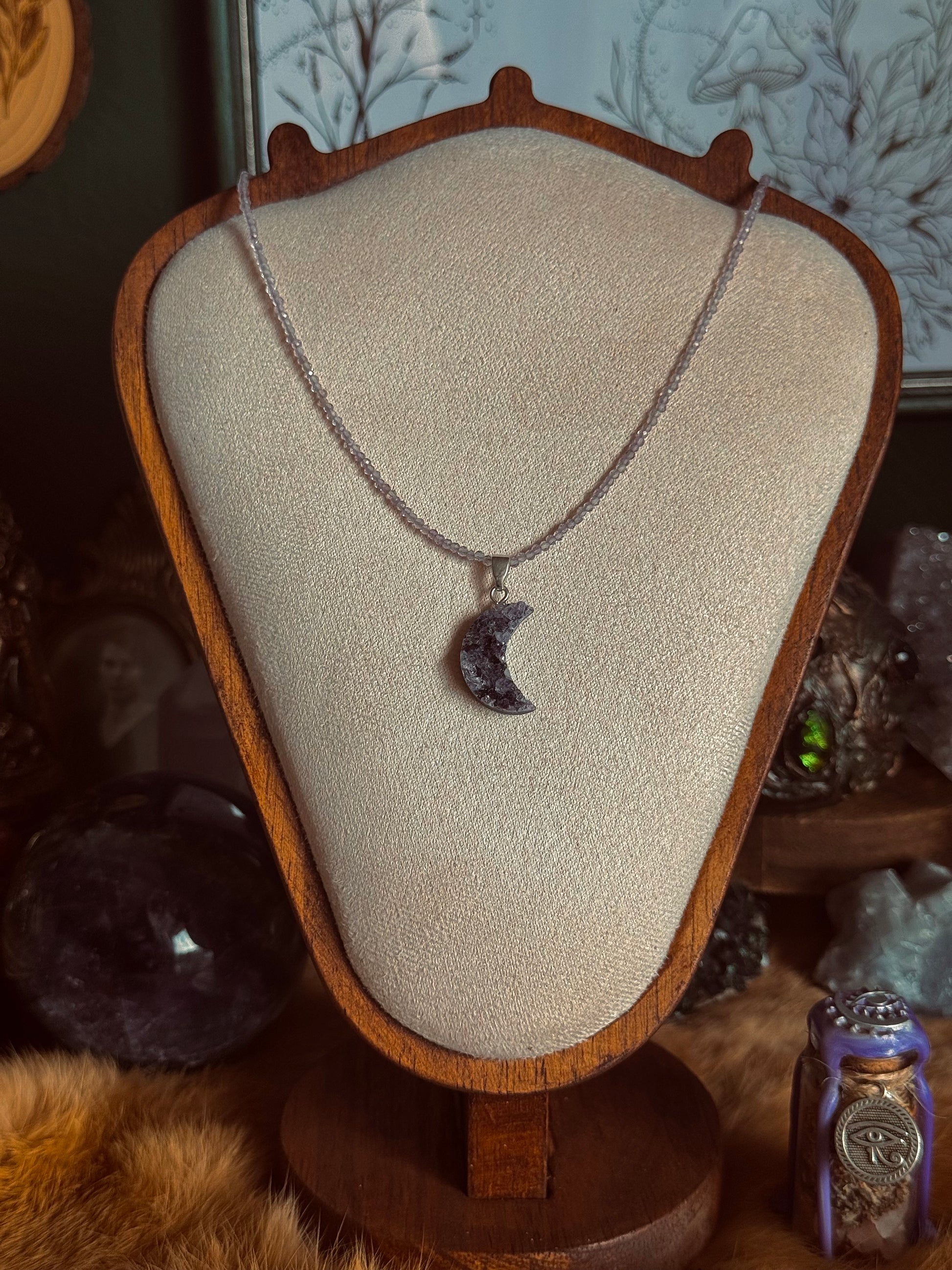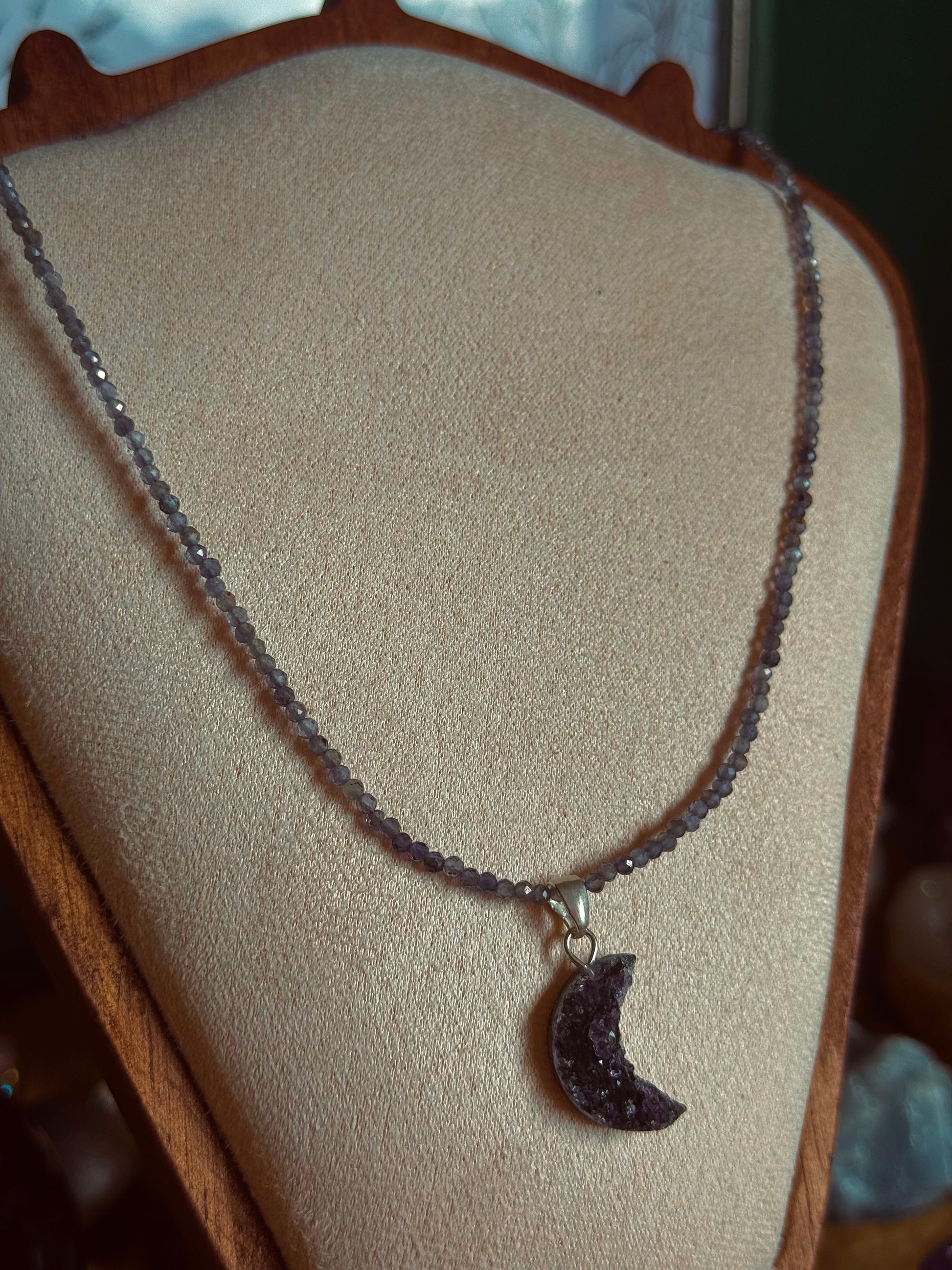 Ein Hauch von Traum und Ruhe: Diese Kette verbindet einen Amethyst-Drusenmond mit sanft violetten Lavendel-Amethyst-Perlen oder Iolithperlen. Jeder Stein trägt sein eigenes Licht, jede Druse ist ein Unikat der Natur. Der Anhänger und der Verschluss sind aus 925er Silber gefertigt und verleihen der Kette eine edle Vollendung.