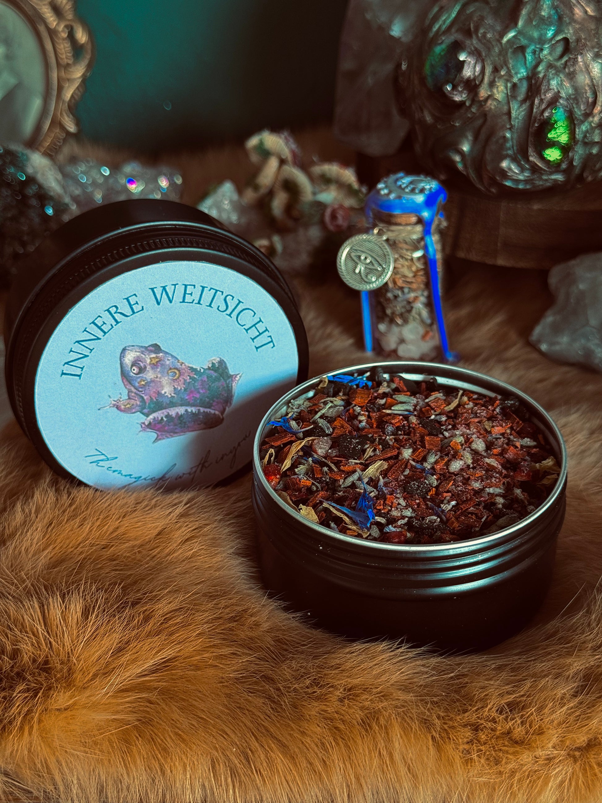 - Die selbstgemachten Räuchermischungen sind für rituelle, spirituelle oder dekorative Zwecke gedacht. Sie werden zur Reinigung, Meditation, energetischen Entfaltung oder als Bestandteil von Zeremonien verwendet. Die Mischung ist nicht für den Verzehr oder für medizinische Zwecke bestimmt.
