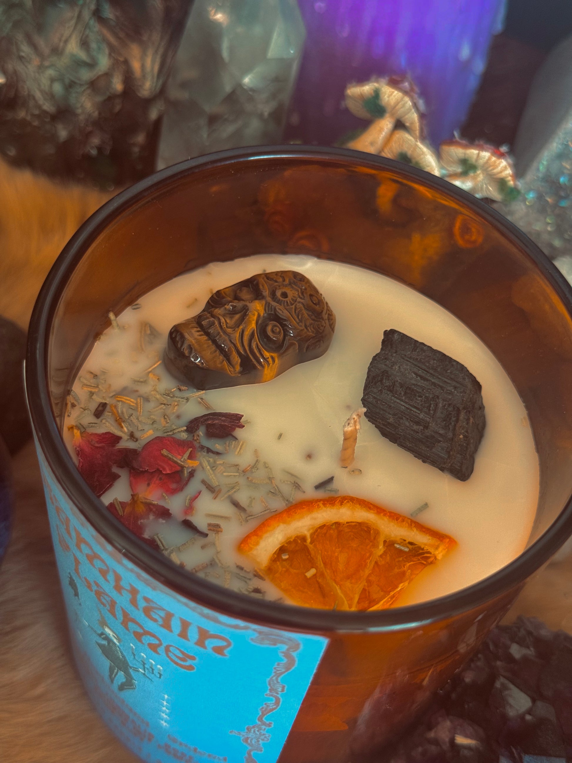Als besondere Begleiter wirken ein schwarzer Turmalin und ein kleines Tigerauge-Carving in Form eines Schädels – Symbole für Schutz, Klarheit und die Erinnerung daran, dass Ende und Neubeginn untrennbar verbunden sind.