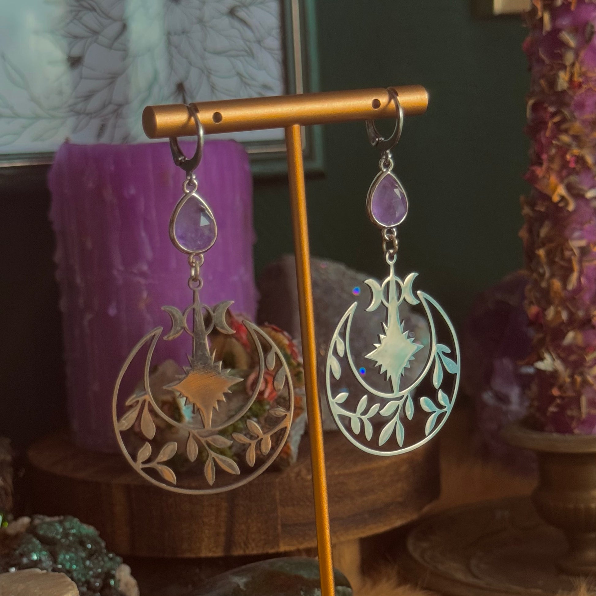 Über dem Mond schwebt ein facettierter Amethyst-Tropfen, eingefasst in Edelstahl. Jeder Stein ist ein Naturprodukt und kann in Transparenz und Farbspiel leicht variieren, was jedes Paar zu einem Einzelstück macht.