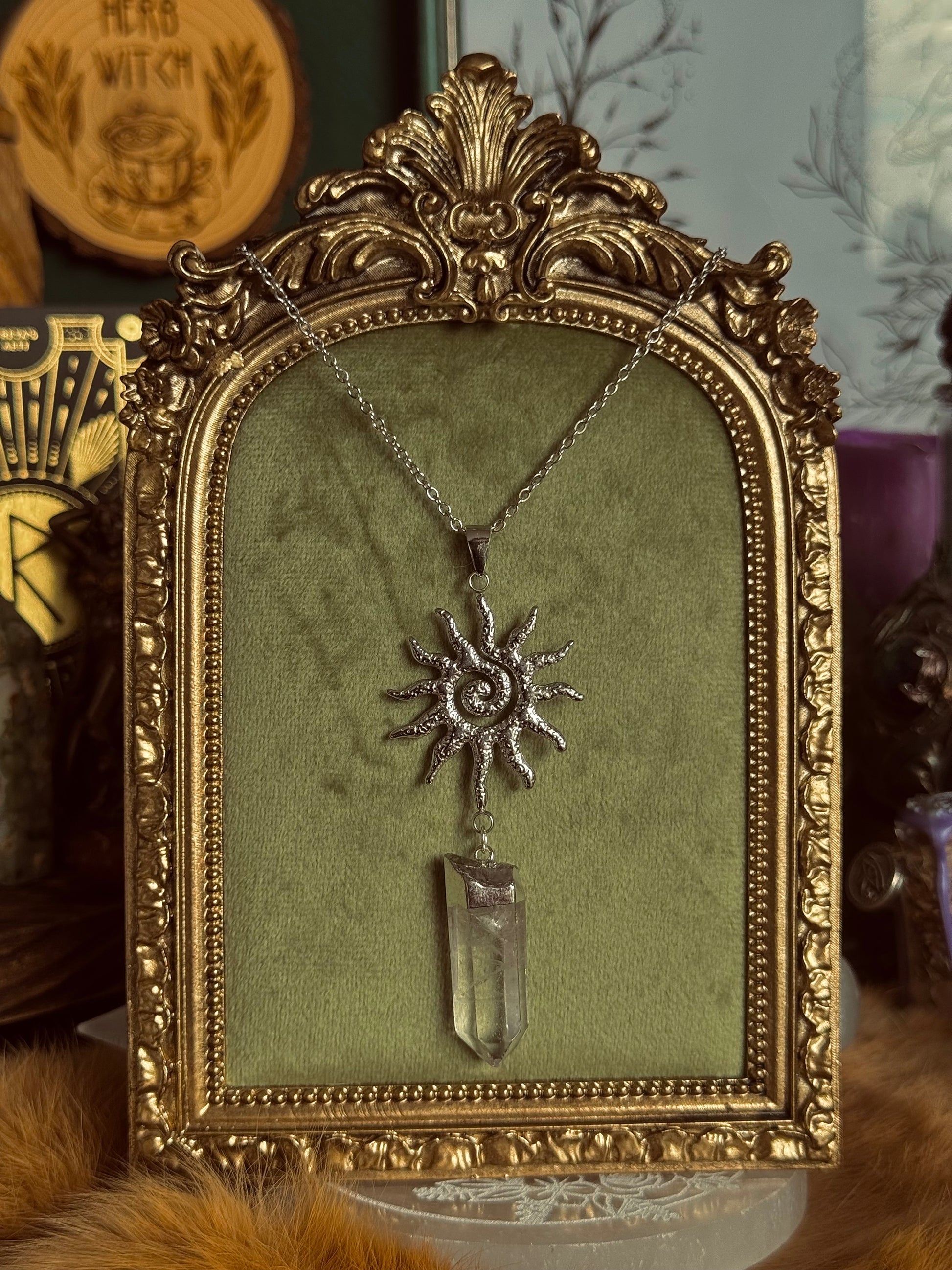 In der Mitte dieser silberfarbenen Edelstahlkette sitzt ein detailreicher Sonnenanhänger mit verspieltem Muster. Darunter hängt eine facettierte Bergkristallspitze, die das Licht sanft einfängt.
