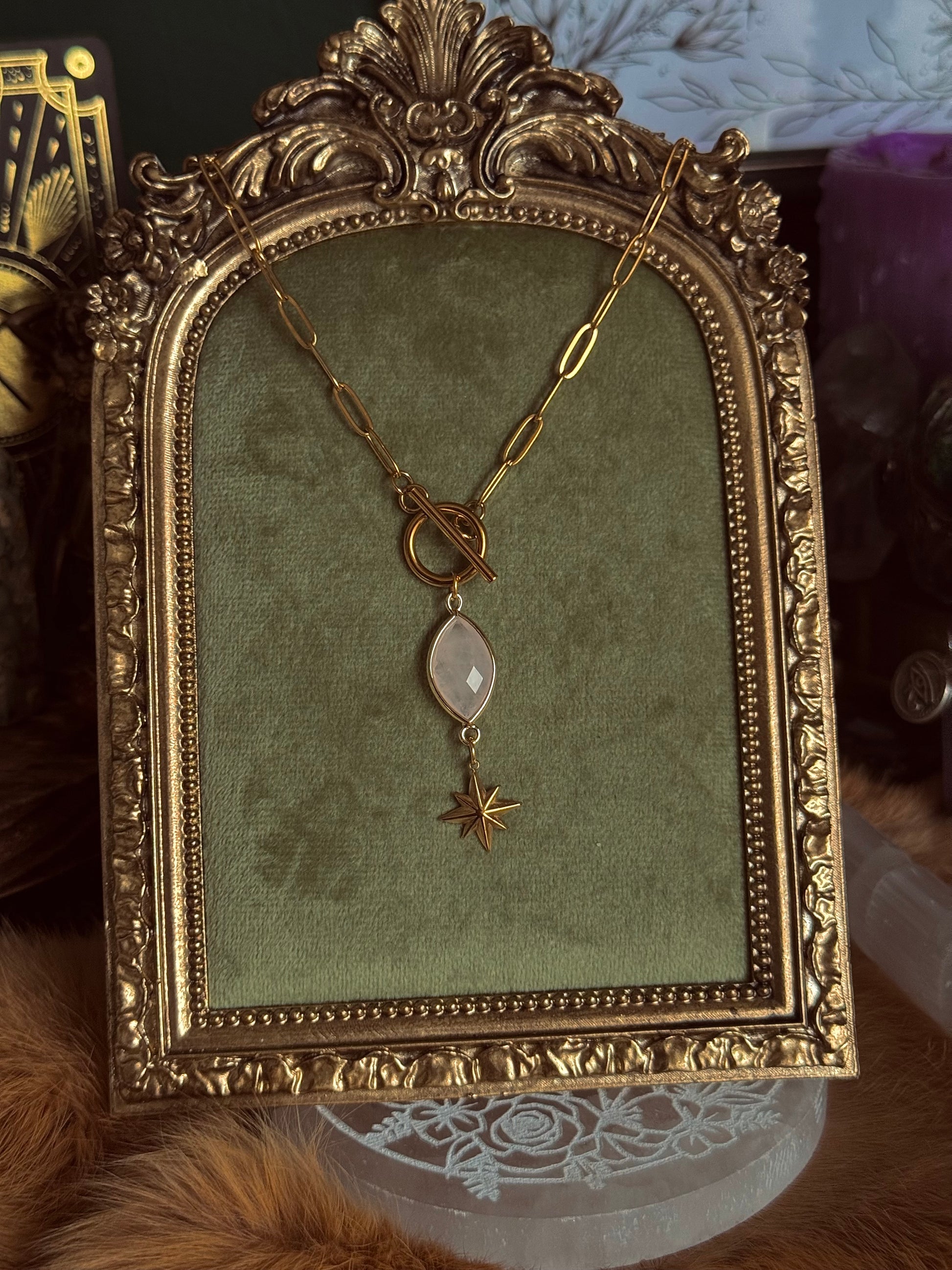 ✨ Material: Rosenquarz (facettiert), Messing, Edelstahlkette 45cm lang, Sternanhänger 18 K vergoldet